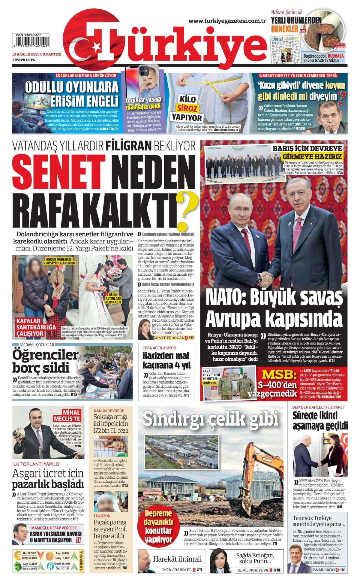 Türkiye Gazetesi 14 Aralık 2025 Günü Manşeti