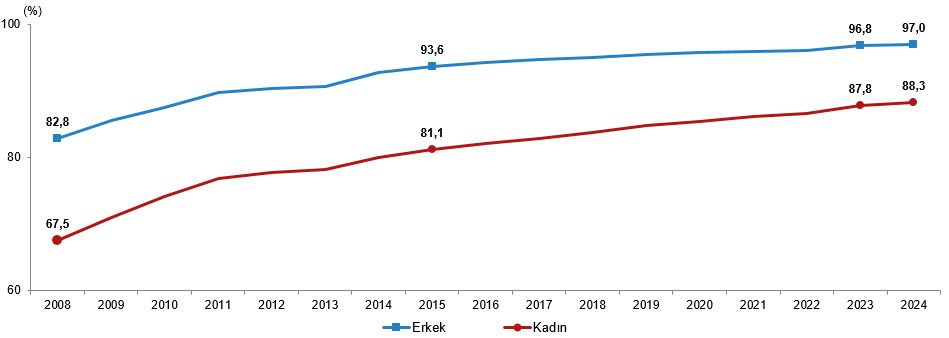 Ulusal Eğitim İstatistiklerine göre en az bir eğitim düzeyini tamamlayan 25 ve daha yukarı yaştaki nüfusun toplam nüfus içindeki oranının 2008-2024 yılları arasında arttığı görüldü. En az bir eğitim düzeyini tamamlayan 25 ve daha yukarı yaştaki bireylerin toplam nüfus içindeki oranı, 2008 yılında %75,1 iken 2024 yılında %92,6 oldu. Bu oran cinsiyete göre incelendiğinde, 2008 yılında en az bir eğitim düzeyini tamamlayan 25 ve daha yukarı yaştaki kadınların oranı %67,5, erkeklerin oranı %82,8 iken, bu oran 2024 yılında kadınlarda %88,3, erkeklerde ise %97,0 oldu.